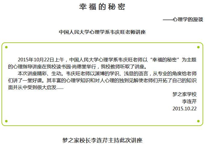 中国人民大学心理学系在梦之家丨韦庆旺老师(讲师 博士)讲座·幸福的秘密——心理学的漫谈